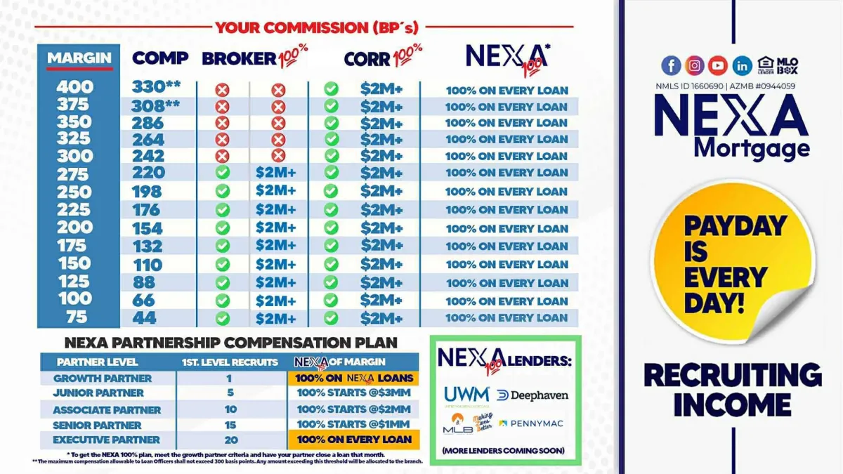 The “Nexa Difference Comp Tool” is NOT an official calculator supplied by NEXA Mortgage, nor was it designed or approved in an official capacity for NEXA Mortgage. This calculator has been verified for its accuracy based on the current NEXA Mortgage Program, based on a 220 bps for personal volume. However, this Calculator is NOT a promise of earnings by NEXA Mortgage or a promise by the person that gave you the URL. It is simply to give you an idea of the kind of income that is possible. This calculator is merely for your enjoyment only. Special Note: Many NEXA Mortgage Loan Originators are doing extremely well financially from this one of a kind profit model. However, a large number of NEXA Mortgage Loan Originators do not even take full advantage of the opportunity and merely join the company for its many other benefits.